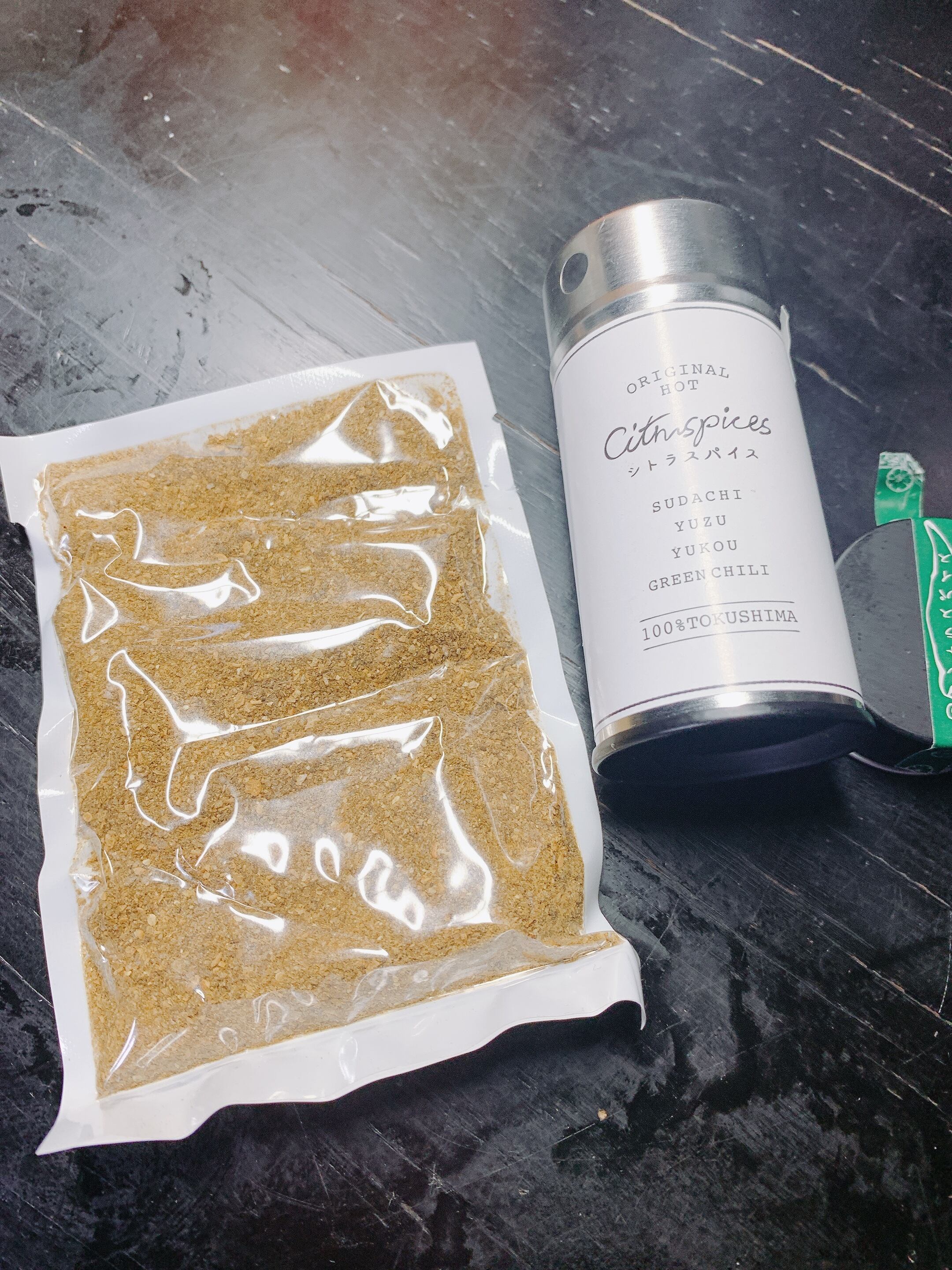 徳島県産の青唐辛子(みまから)と徳島県産のすだち、ゆず、ゆこうを乾燥して粉末にした調味料です。